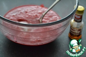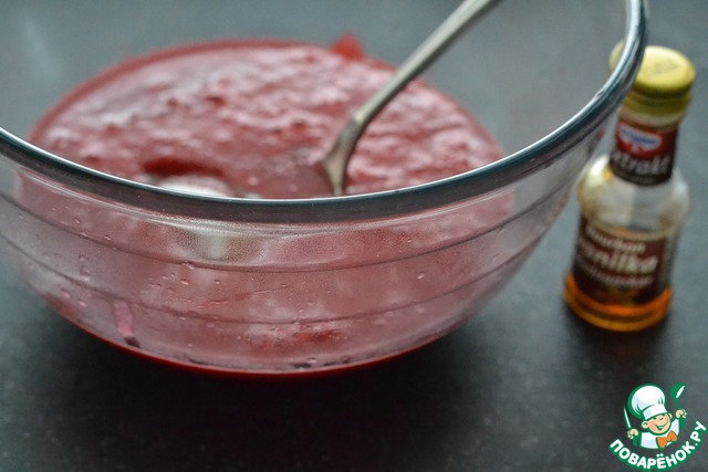 Когда малиновый сладкий сок слегка остынет добавить в него ванильный экстракт и набухший желатин. Хорошо размешать и отставить в сторону. -