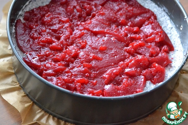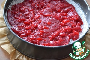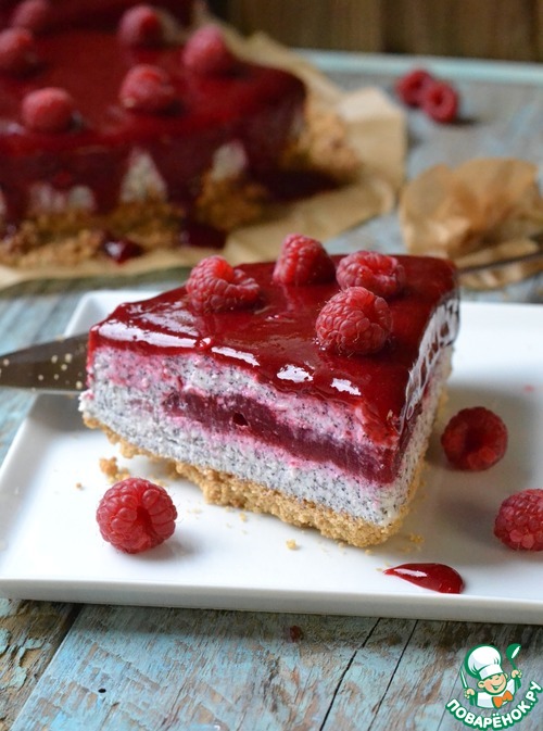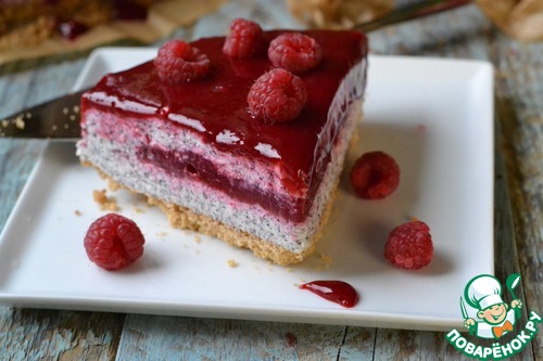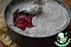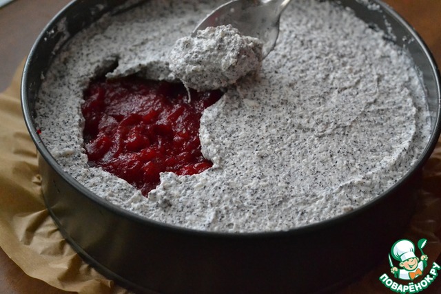 На охлажденную основу торта выложить половину маковой массы. Сверху, отступив от края, посередине выложить малиновый слой, который уже начал застывать и выглядит, как желе. Разровнять.