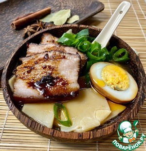 • Придётся ещё немного повозиться. Добавляем к мясу и яйцам бульон в котором отваривали мясо, готовую лапшу (конечно китайскую, но можно и любую другую), лук, немного нарезанного чеснока, и соевого соуса. Сбрызгиваем всё тёмным кунжутным маслом и соусом, оставшимся от тушеного мяса. Кто любит остренькое - добавьте мелко нарезанный перец чили.