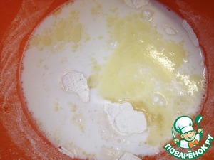 Добавить тёплое молоко, тёплую воду и растопленное сливочное масло. Замесить тесто. Муки может уйти немного больше.
