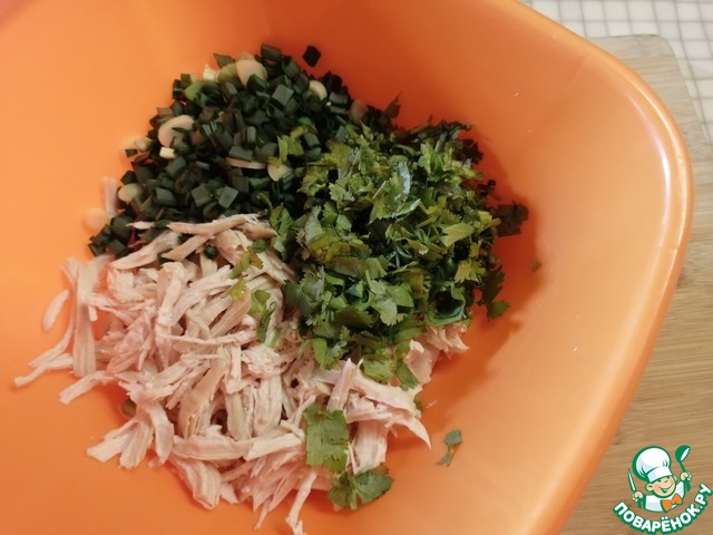 Куриное филе разделить на волокна. Добавить мелко порезанный зелёный лук и кинзу.