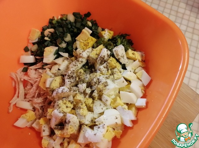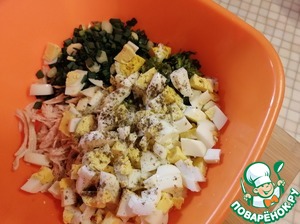 Крупно порезать варёные яйца и отправить к остальным ингредиентам. Посолить и поперчить по вкусу. Перемешать.