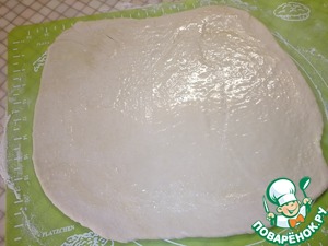 Тесто разделить на три части. Каждую часть тонко раскатать и смазать растопленным сливочным маслом.