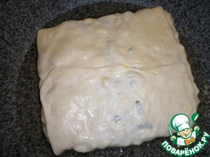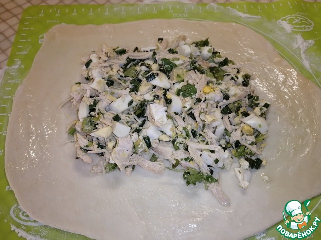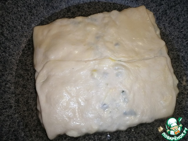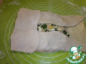 Завернуть края, чтобы получился прямоугольник. И аккуратно раскатать сверху, чтобы начинка распределилась внутри.