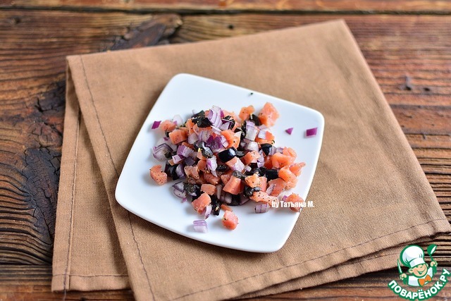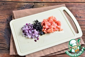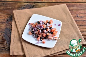 Мелкими кубиками порезать рыбу, маслины, лук.