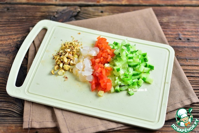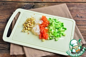 Мелкими кубиками порезать огурец, помидор, маринованный лук, орехи раздробить.