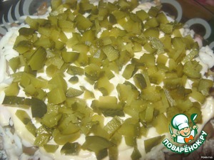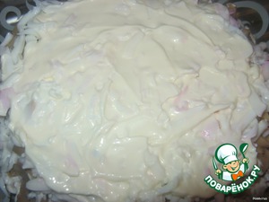В салатник выкладываем слоями, промазывая майонезом: