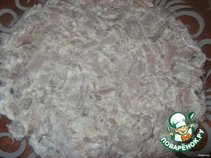 Мясо нарезать небольшими кусочками, перемешать с майонезом.