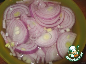 Лук нарезать полукольцами, замариновать.