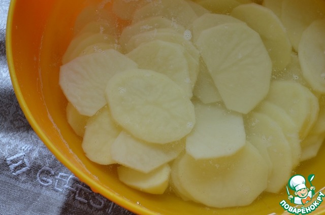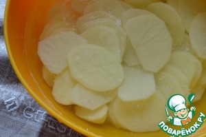 Картофель вымыть, почистить и нарезать тонкими слайсами.