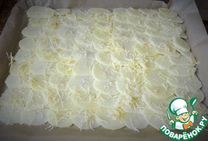 Половину твёрдого сыра натереть на мелкой тёрке, рассыпать на бумагу для выпечки и поместить в противень (стандартный). Разложить слайсы картофеля, внахлёст.