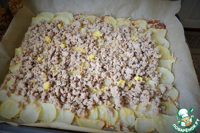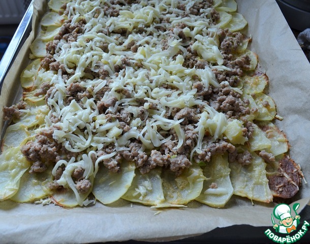 Таким образом разложить весь картофель, сверху рассыпать оставшийся сыр.