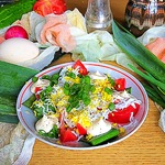 Иногда и не надо много разных продуктов для приготовления салата, главное ведь Ваше вдохновение. Буквально пару основных продуктов, зелень и заправка. Вот и сегодня - один крупный помидор и пара варёных яиц, несколько мелких кулинарных штрихов и на столе вкусный, красивый и полезный салат. Готовьте с вдохновением, радуйте любимых и дорогих.