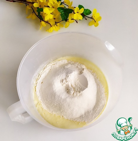 Далее просеять муку с разрыхлителем и перемешать на низкой скорости до однородности.
