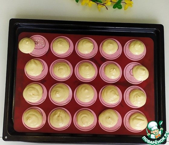 Переложить тесто в кондитерский мешок, отсадить на пергамент (силиконовый коврик) печенюшки диаметром примерно 3 см. Более высокие, чтобы при выпекании не расплющились. Выпекать 10-15 минут в разогретой духовке до 180°С. Печенье должно оставаться светлым и мягким, не нужно его пересушивать. Достать из духовки и остудить.