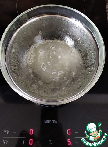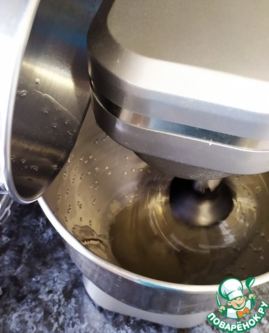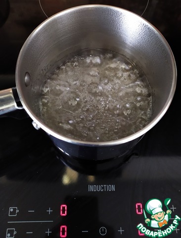 В сотейнике с толстым дном смешать сахар (110 г), воду (30 мл) и поставить сироп на средний огонь и, помешивая, дождаться закипания. Затем огонь убавить до минимального и проварить сироп пару минут. Пока кипит сироп, начать на низкой скорости взбивать желатин.