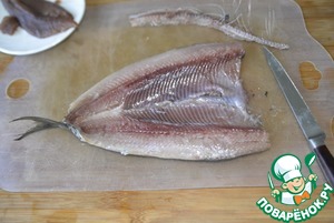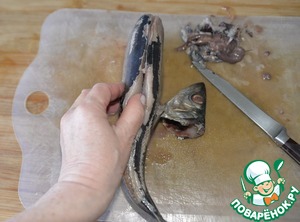 Острым ножом делаем глубокий надрез вдоль хребта и достаём хребет, стараясь не порвать брюшко.