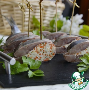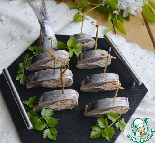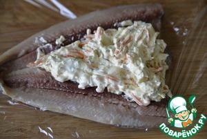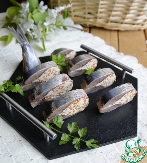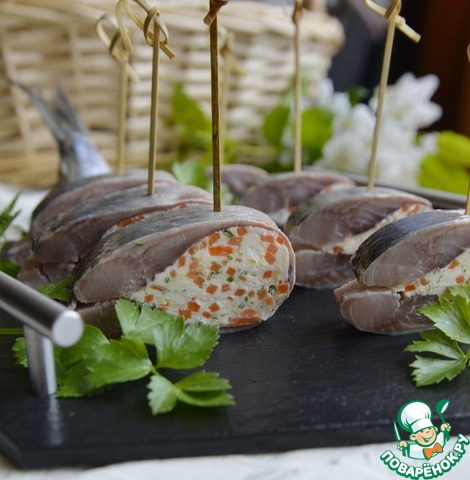 Кладём творожную начинку посредине сельди.