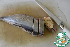 Перед подачей достаём сельдь из морозилки, нарезаем наискосок на кусочки толщиной около 1,5 см.