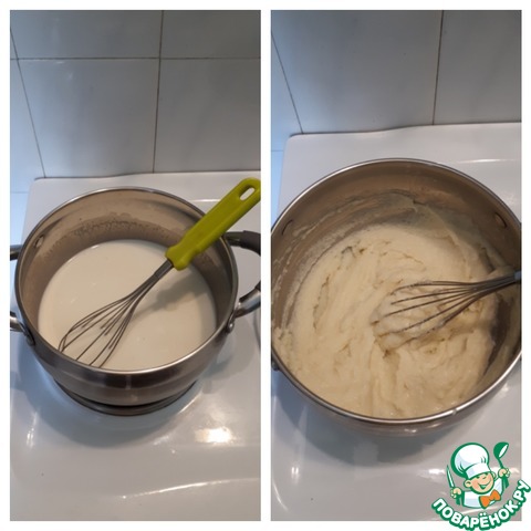 Из молока и крупы сварить манную кашу, она получается очень густая, отставить ее остывать.