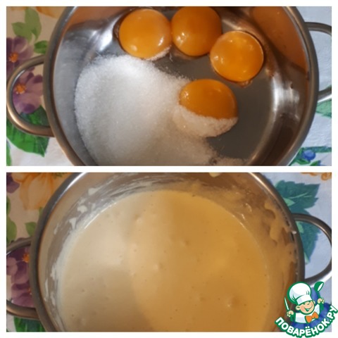 Яйца разделить на белки и желтки. Желтки хорошо растереть с 80 гр. сахара.