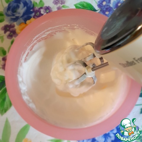 Отдельно взбиваем миксером белки с 50 гр. сахара до увеличения массы и устойчивых пиков.
