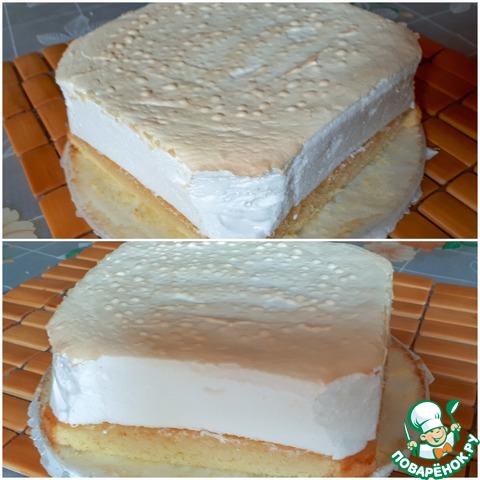 Берем форму с испекшимся бисквитом и выкладываем туда всё безе, равномерно его распределяя. Отправляем в разогретую до 200 градусов духовку на 5 минут.