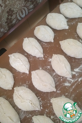 Затем ставим тесто в теплое место для подъёма. Оно очень быстро поднимается. Обминаем его и снова даём ему подойти. После этого можно приступать к лепке пирожков. Из этого количества теста получается где то порядка 30-35 пирожков. Отрываем тесто небольшими кусочками и выкладываем его на стол, присыпанные мукой. Это необходимо, т. к. тесто у нас не густое.
