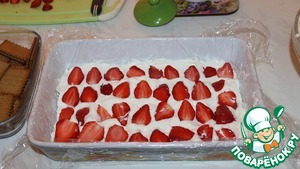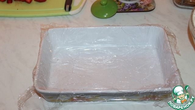 И так до конца. Последний оставляем слой крема. Прикрываем свисающими концами пищевой пленки. Убираем в холодильник на 4-5 часов, можно на ночь.