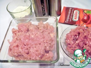 Понадобится ~ 700 г. светлого фарша, и ~ 300 г. крупно-рубленного темного мяса. В светлый фарш добавьте сухое молоко, соль (3/4 ч. л.), и свежемолотую смесь перцев-хорошо вымешайте фарш (чтобы не осталось комочков сухого молока). В крупно-рубленный фарш добавьте оставшуюся соль (1/4 ч. л.) и паприку, тоже хорошо перемешайте.