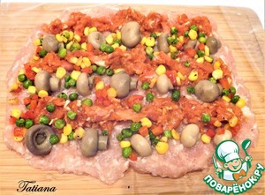 Отрежьте лист от рукава для запекания длиннее формы на ~20 см., разрежьте вдоль с одной стороны. На стол (разделочную доску)положите пленку, выложите светлый куриный фарш, сверху разложите рядами грибы и фарш с паприкой, поверх разбросайте (произвольно)остывшие горошек-кукурузу-перец.