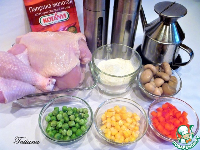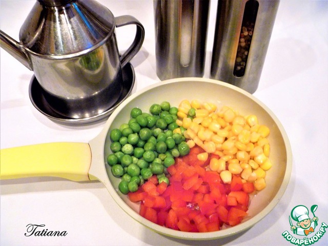 В первую очередь подготовьте овощные добавки. Шампиньоны (целые, и желательно мелкие) выложите на слои бумажного полотенца, чтобы избавить грибы от лишней влаги. В небольшом количестве растительного масла потушите до полуготовности горошек, кукурузу, и красный сладкий перец (замороженные овощи не размораживайте), немного посолите и поперчите. Дайте овощам остыть.