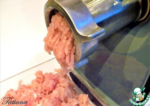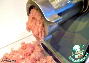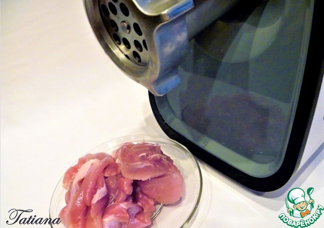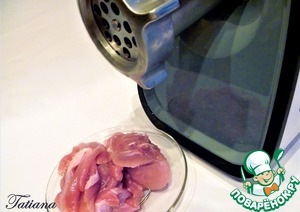 Куриное мясо ( понадобилось две небольшие грудки + две голени + два бедра ( без кожи)) срежьте с костей, измельчите при помощи мясорубки. Филе грудки -мелкая решетка (измельчите дважды).