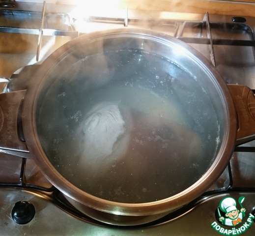 Рульку кладём в кастрюлю с кипящей водой и варим 10-15 минут.
