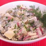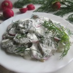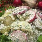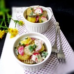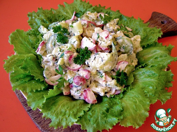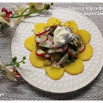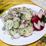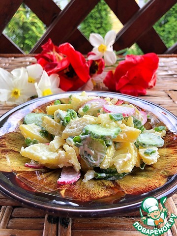 Вкусный салат с молодой картошкой, редиской, солёными огурцами и зеленью из нашего весеннего меню.