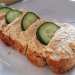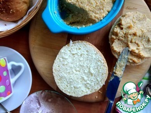 Утром вынула паштет из холодильник. Паштет хорошо застыл, но если вы добавите побольше сливочного масла, он будет ещё нежней и поплотней. Паштет готов! Режем булочку.
