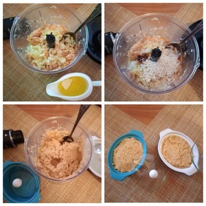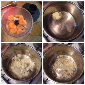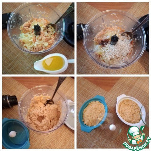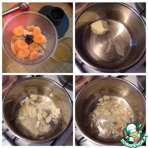 Вначале нужно отварить куриное мясо. Непринципиально какое, главное, чтобы была мякоть, которую потом легко можно было измельчить в блендере. Варим курицу в бульоне, добавив в него морковь, лук репчатый прямо в шелухе, чеснок, перец душистый горошком и соль. Варим минут 30. Вынимаем курицу из бульона и разрезаем на кусочки, выкладываем в блендер. Также достаём из бульона морковь и тоже, нарезав её, отправляем в блендер. Наливаем туда же сначала 50 мл бульона, измельчаем и, если масса суховата, то ещё добавляем. У меня налилось 70 мл примерно. На сковороду выкладываем кусок масла примерно 20 г, остальное кладём в посуду и ставим в СВЧ на 55 секунд при мощности 800 растопиться. На сливочном масле золотим лук, сильно не зажаривать, а то невкусно будет. -