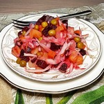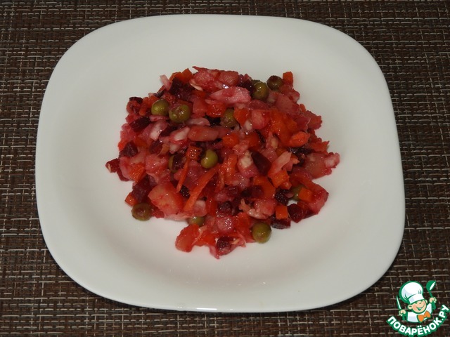 Если очень хочется винегрета, а в холодильнике нет квашенной капусты и солёных или маринованных огурцов, предлагаю вам замену. Винегрет получается очень сочный, с насыщенным вкусом, остренький, от которого просто тяжело оторваться.