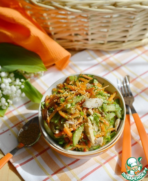 Часто готовлю похожий салат. Только добавляю тонко нашинкованый дайкон (примерно столько же, сколько и моркови).
