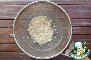 Рис заливаю кипятком, оставляю на 20 минут. Сливаю воду, крупу промываю и откидываю на сито, чтобы стекла лишняя влага, а рис подсох.
