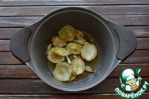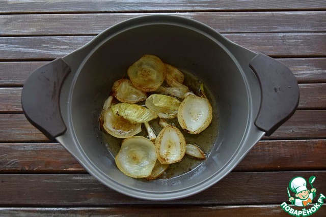 В сотейнике разогреваю смесь из сливочного и растительного масла. Лук разрезаю пополам и обжариваю в масле. После чего удаляю его, он больше не потребуется.