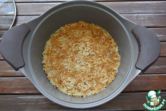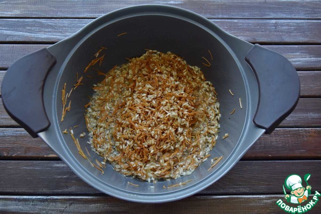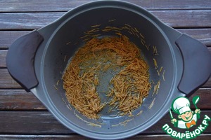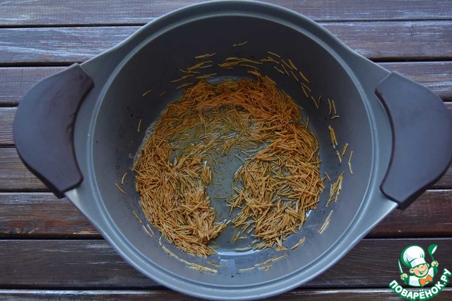 Всыпаю в ароматизированное масло вермишель и непрерывно помешивая обжариваю ее до золотистого цвета в течение 2 минут.