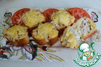 Сыр потереть, грибы порезать мелко, все смешать и добавить йогурт и соль. Выложить начинку на батон и запекать 10 минут. Готово! Приятного аппетита!