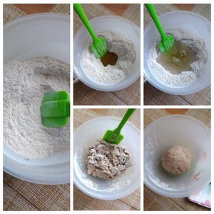 Делаем тесто. В посуду просеиваем обе муки. Добавляем дрожжи сухие быстродействующие, сахар, соль и лопаточкой всё перемешиваем. Делаем углубление и наливаем масло оливковое и воду тёплую. Можно масло заменить на подсолнечное, но с оливковым вкусней для меня. Начинаем замешивать лопаткой. Как только тесто возьмёт всю муку, работаем руками. Руки нужно смазать маслом. Тесто отличное, к рукам не пристаёт. Скатываем его в шар. Помещаем в посуду, накрываем полотенцем и ставим в тёплое место. Я для этого грею духовку до т-50 С. Тесто оставляем для подъёма на 30 минут.