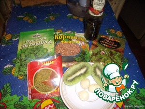 Киви режем мелкими кубиками, чеснок давим, добавляем пряности. Всем этим обмазываем курицу. Солим, поливаем соевым соусом. Оставляем на 1 час мариноваться.