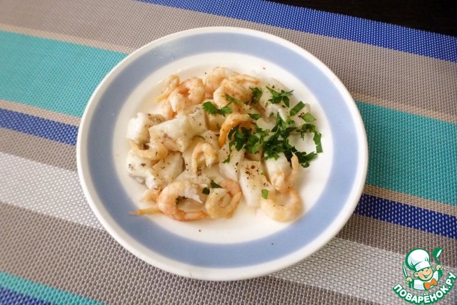 Смешать кусочки зубатки и креветки с нарезанной петрушкой.
