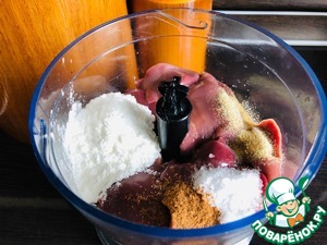 1. Печень моем и убираем всё лишнее. Перекладываем печень в чашу блендера, добавляем соль, черный молотый перец, сушёный чеснок, кукурузный крахмал, соединяем в однородную массу.