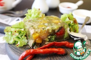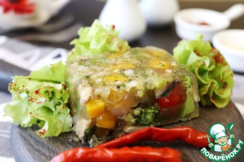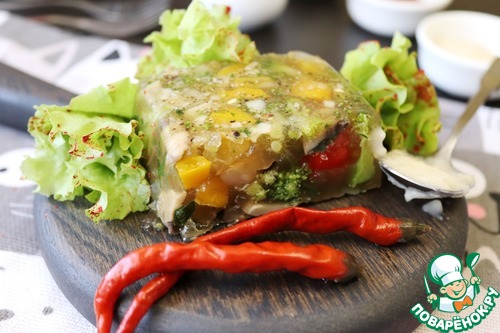 Легкое, прохладное заливное из зелени, овощей и шампиньонов прекрасно подойдёт для летних денёчков. Это и полезно, и вкусно, и достаточно сытно. Кроме того, состав можно подобрать по вкусу, это может быть и пекинская капуста, зеленый горошек, спаржа и другое. Для красивого и аппетитного вида овощи лучше подбирать разноцветные и яркие.