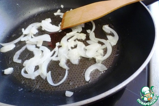 На разогретой сковороде с минимумом растительного масла сначала обжарить до прозрачности репчатый лук, буквально пару минут.