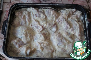 Тушку курицы помыть и нарезать порционными кусочками. Посолить по вкусу.